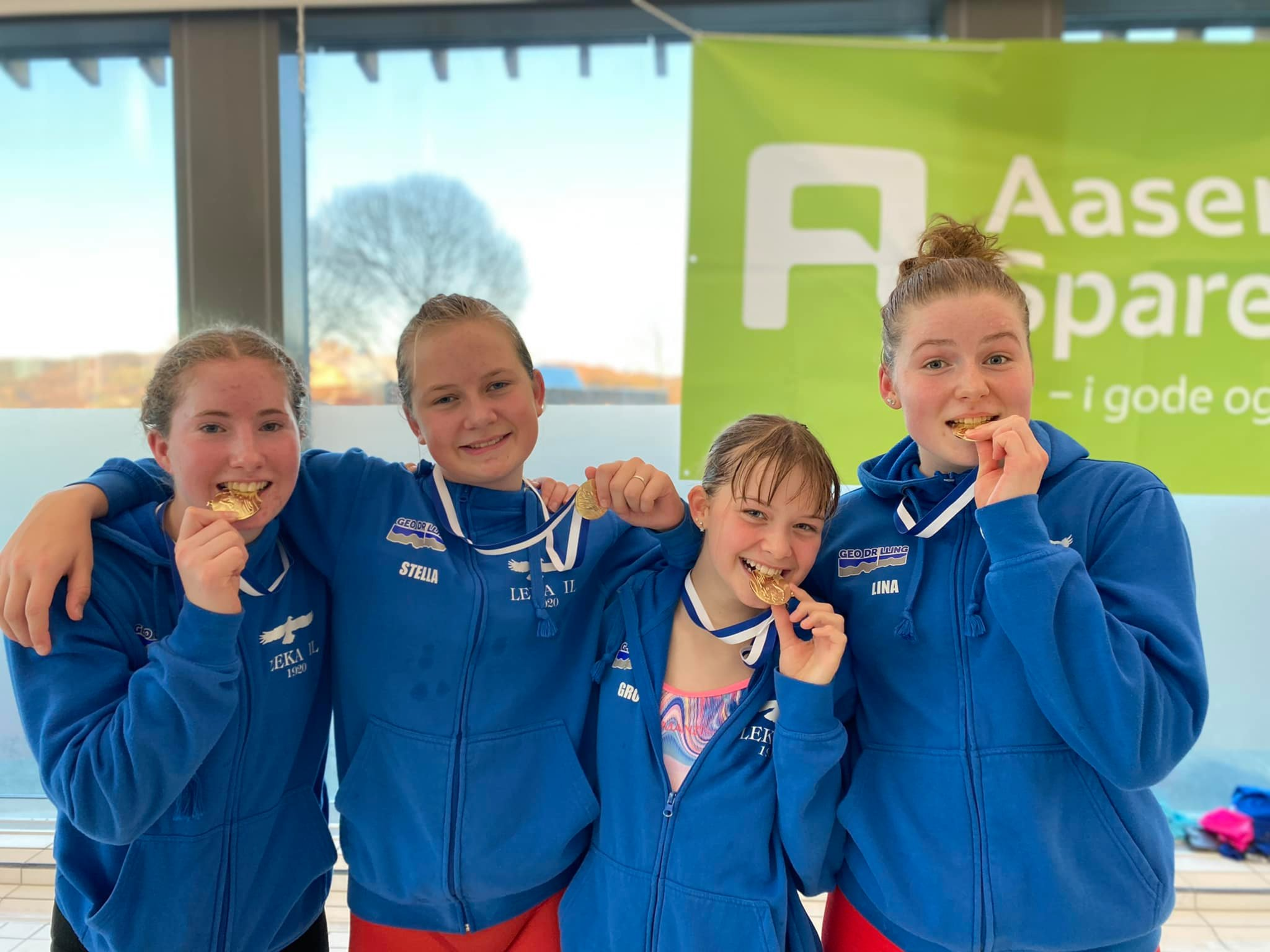 Leka svømmegruppe tok sin første stafett seier! Gulljentene Hanna Annie Leknes, Stella Sørli Hanssen, Emma Furre Solberg og Lina Sørli Hanssen slo Namsos og Verdal på 4x50m fri med tiden 2.09,30