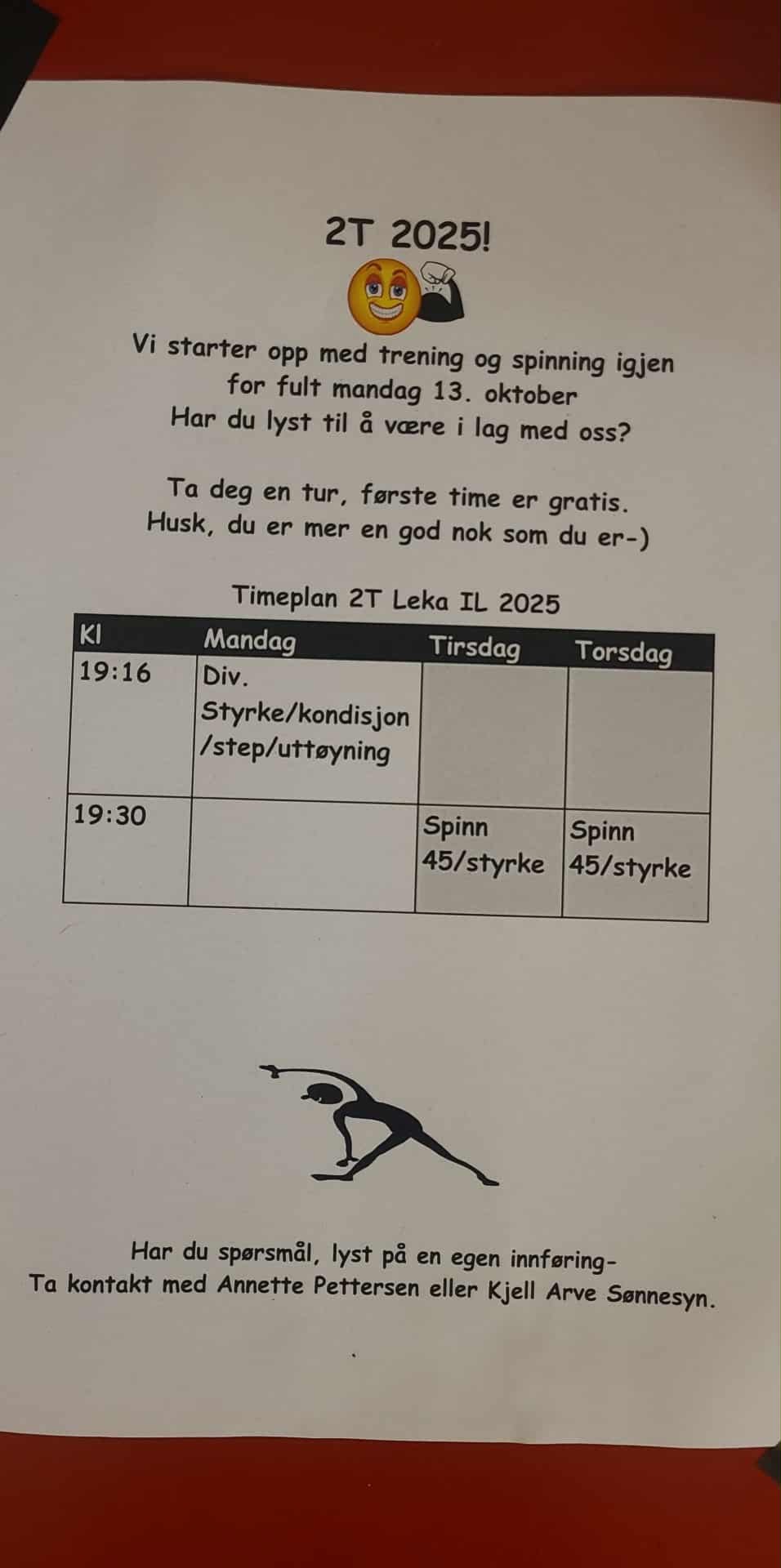 Før man kan benytte seg av 2t må man først ha betalt medlemsavgift i Leka IL.